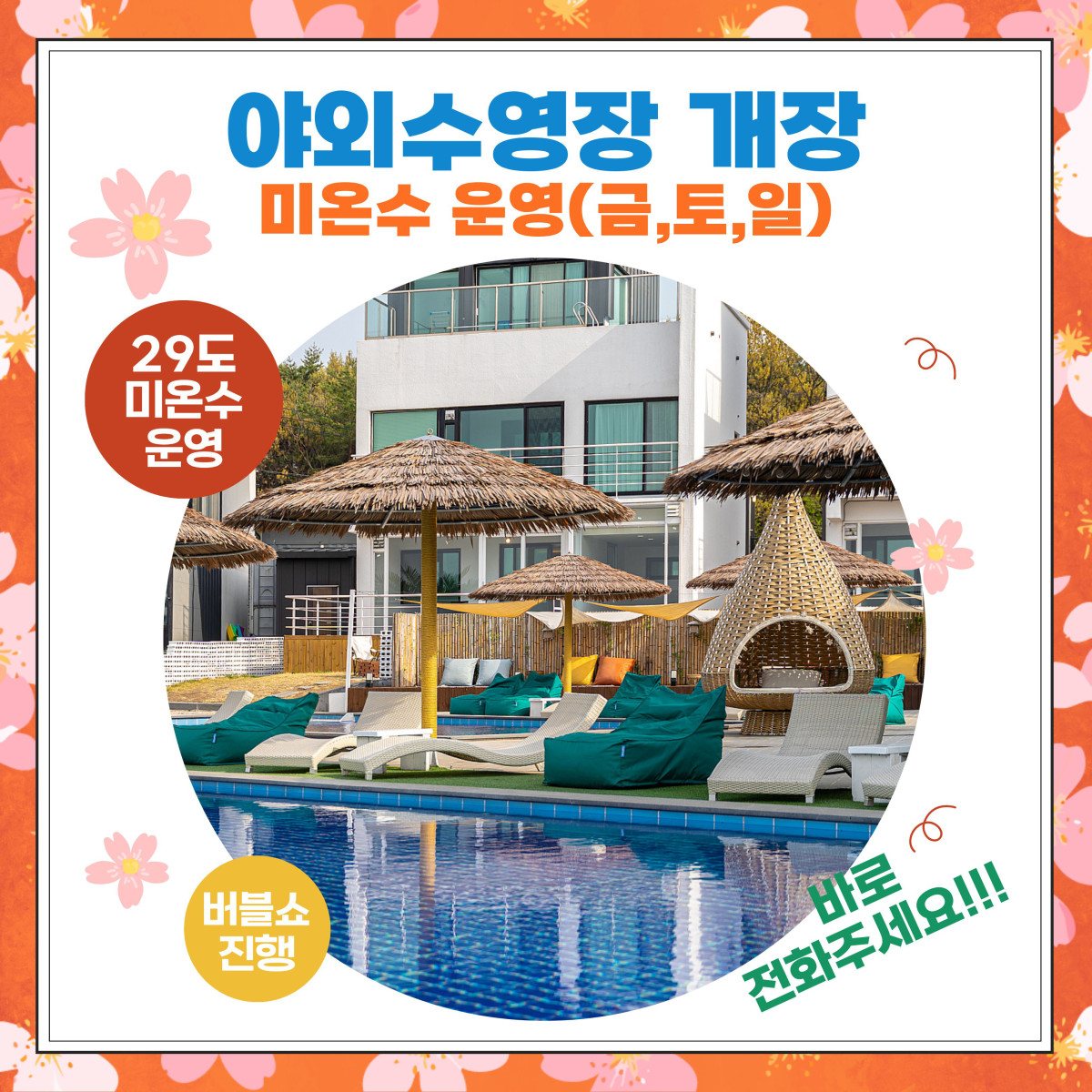 야외수영장 미온수 29도로 운영합니다. (금,토,일)
